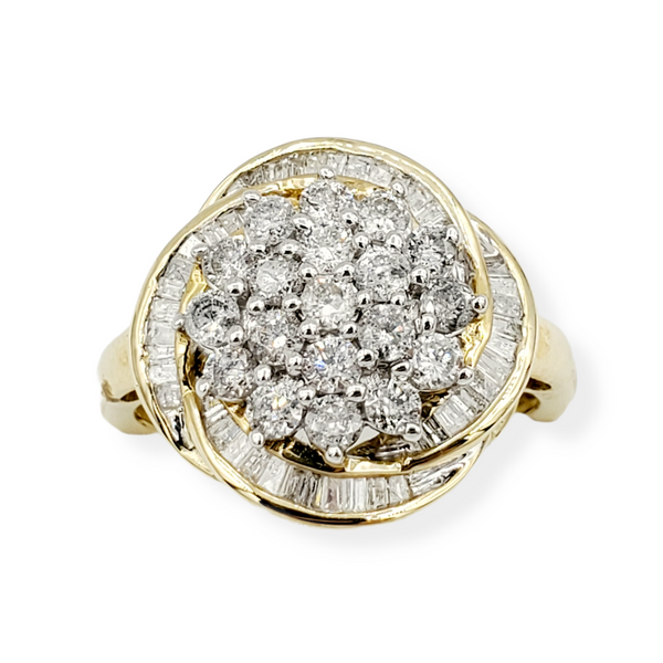 . 10kt yellow gold ring with nineteen prong set round brilliant cut diamonds 0.70ct. Clarity: I-1 to I-3
